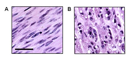 Figure 2. Gastrointestinal stromal tumors (GISTs) can show spindle cell or epithelioid histomorphology. A subset of tumors presents with a mixed phenotype. (A) GIST composed of neoplastic spindle cells. Note the blunt-ended nuclei that are reminiscent of smooth muscle cells. (B) GIST of the epithelioid type. H&E stains, scale bar indicates 50 µm. (Figure graciously provided by Anette Duensing, M.D.)