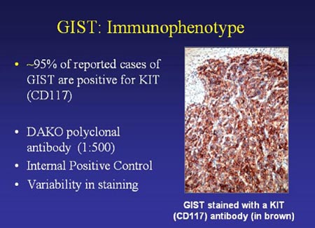 For two recent reviews of GIST diagnosis and descriptions of pathology results for gastointestinals stromal tumor, see Parfitt et al (2006) and Miettinen and Lasota (2006). There is a special link to the latter paper on our site.