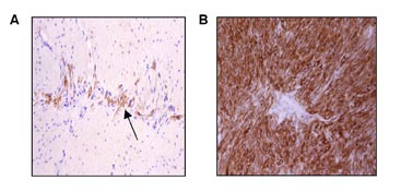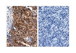 Figure 6. Protein kinase C theta (PKC theta) immunohistochemistry shows strong expression in a gastrointestinal stromal tumor (A) and no expression in a leiomyosarcoma (B). From Duensing et al , Cancer Research 2004; 64:5127-5131.
