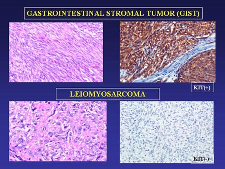 Figure 5 compares cells of leiomyosarcoma, the most frequent competing diagnosis, and spindle-cell GIST. Though the unstained samples appear similar, leiomyosarcoma cells do not stain for KIT. The discovery that GISTs are immunoreactive for KIT provided the first way to definitively separate GISTs from other tumors with similar appearance.