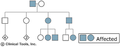FIGURE 11. AUTOSOMAL DOMINANT PEDIGREE ACROSS GENERATIONS. IMAGE USED WITH PERMISSION OF CLINICAL TOOLS, INC. VIA WWW1.GENETICSOLUTIONS.COM